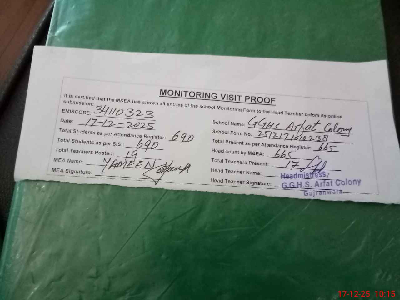 | Attendance Register | Head Teacher | MEA with School | Visit Proof |