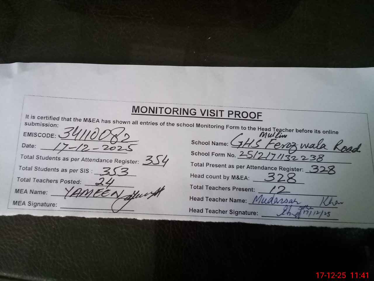 | Attendance Register | Head Teacher | MEA with School | Visit Proof |