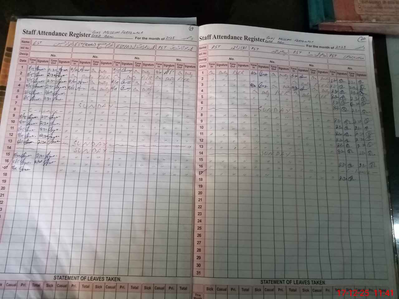 | CNIC | Full Name | Designation | R/C | Absence During Last Calender Month |