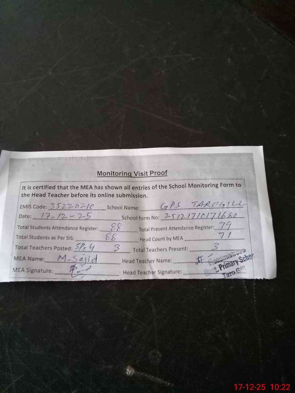 | Attendance Register | Head Teacher | MEA with School | Visit Proof |