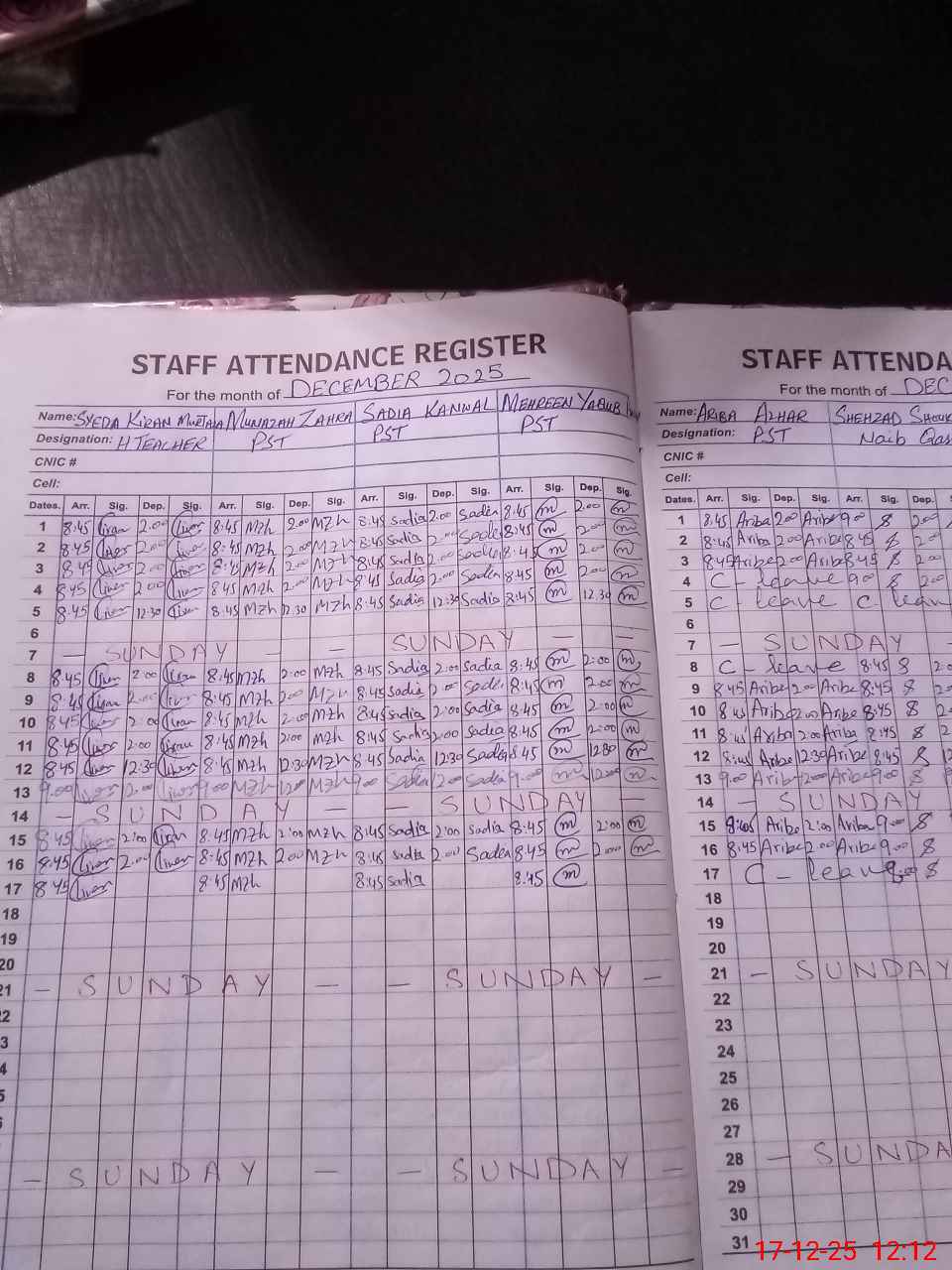 | CNIC | Full Name | Designation | R/C | Absence During Last Calender Month |