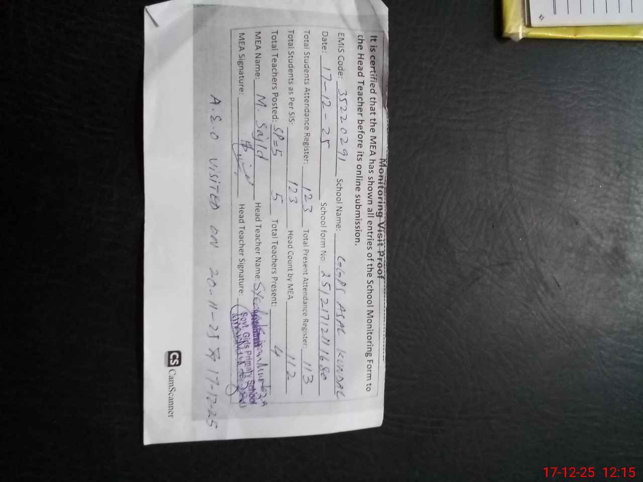 | Attendance Register | Head Teacher | MEA with School | Visit Proof |