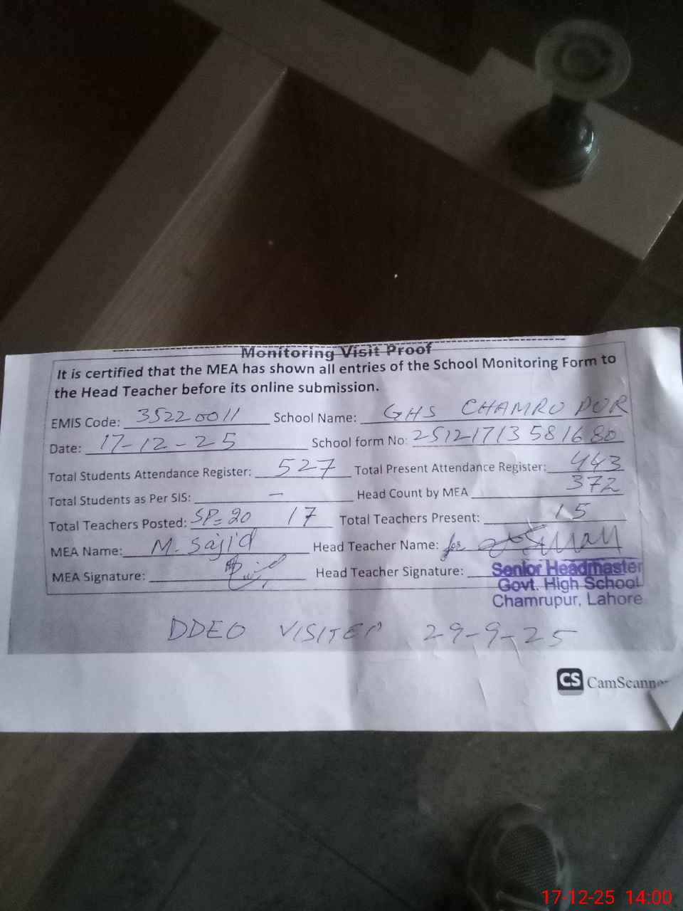 | Remarks (Use Separate Page if Required): A difference of 71 students found in Roznamcha and head count 443 students marked present in Roznamcha whereas 372 students were present on head count out of 527 School head Suleman CJ Gill has gone to attend a meeting in DEO Office School has two buildings and both are being used for teaching D3 was not available 35220011 | |||||