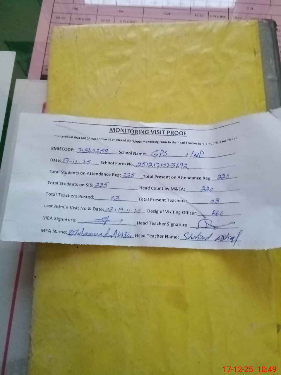 | Attendance Register | Head Teacher | MEA with School | Visit Proof |