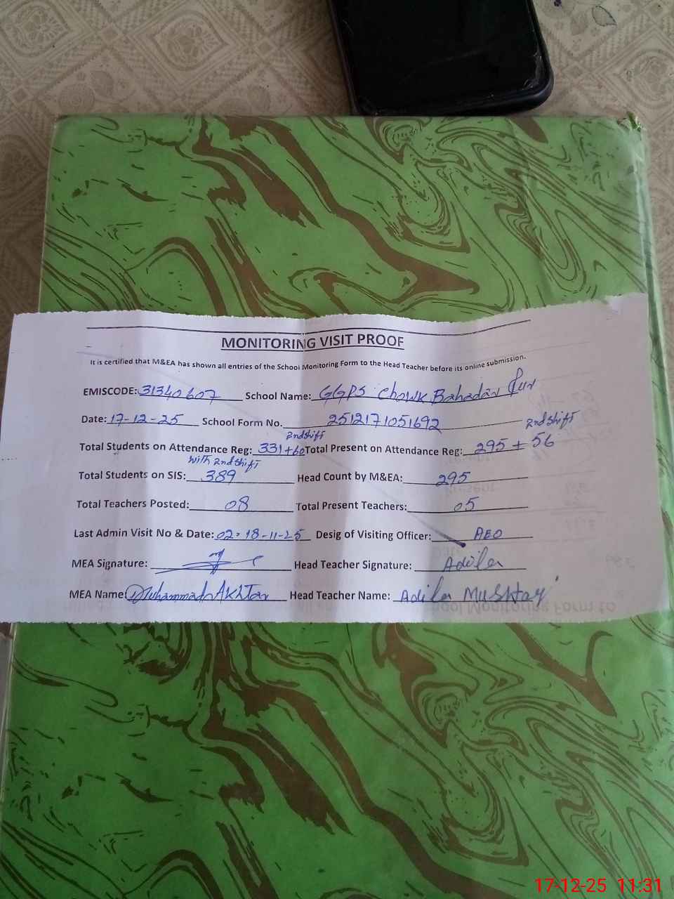 | Attendance Register | Head Teacher | MEA with School | Visit Proof |