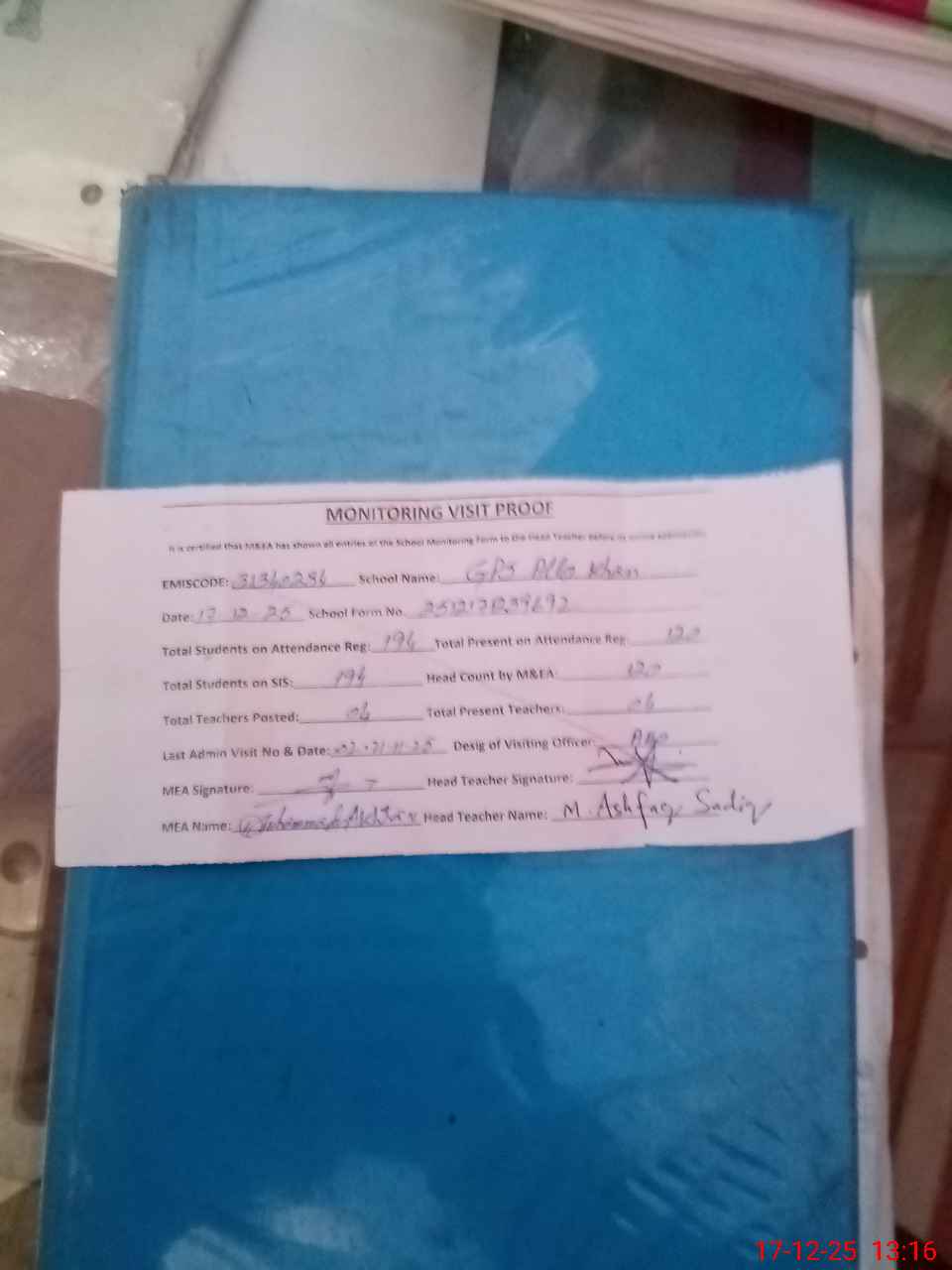 | Attendance Register | Head Teacher | MEA with School | Visit Proof |