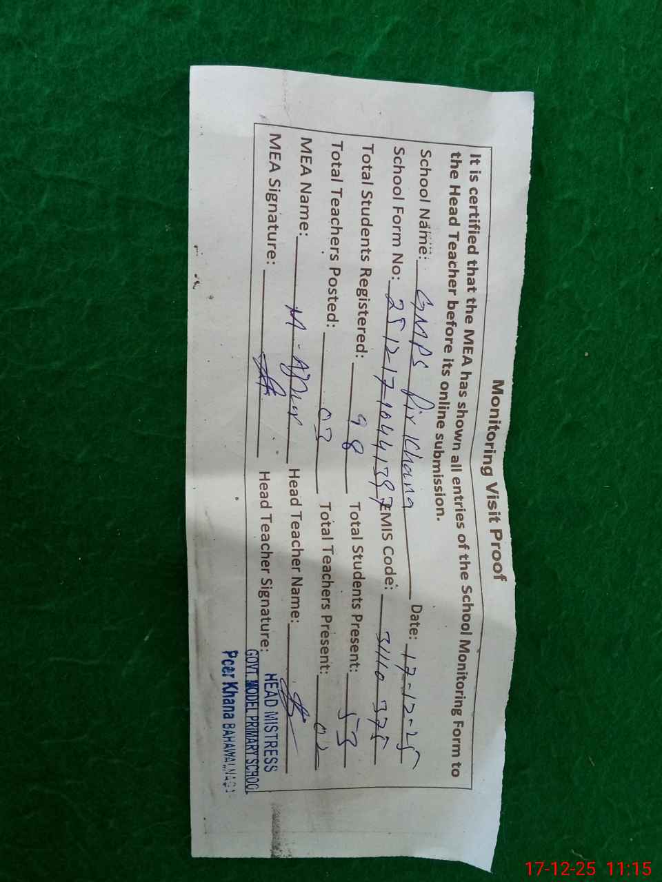 | Attendance Register | Head Teacher | MEA with School | Visit Proof |