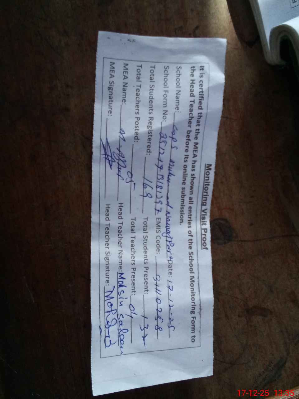 | Attendance Register | Head Teacher | MEA with School | Visit Proof |