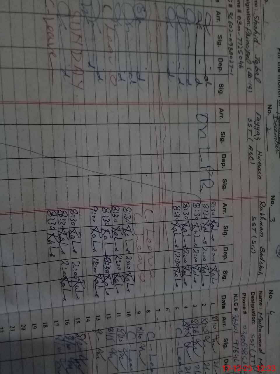 | CNIC | Full Name | Designation | R/C | Absence during last cal. month |