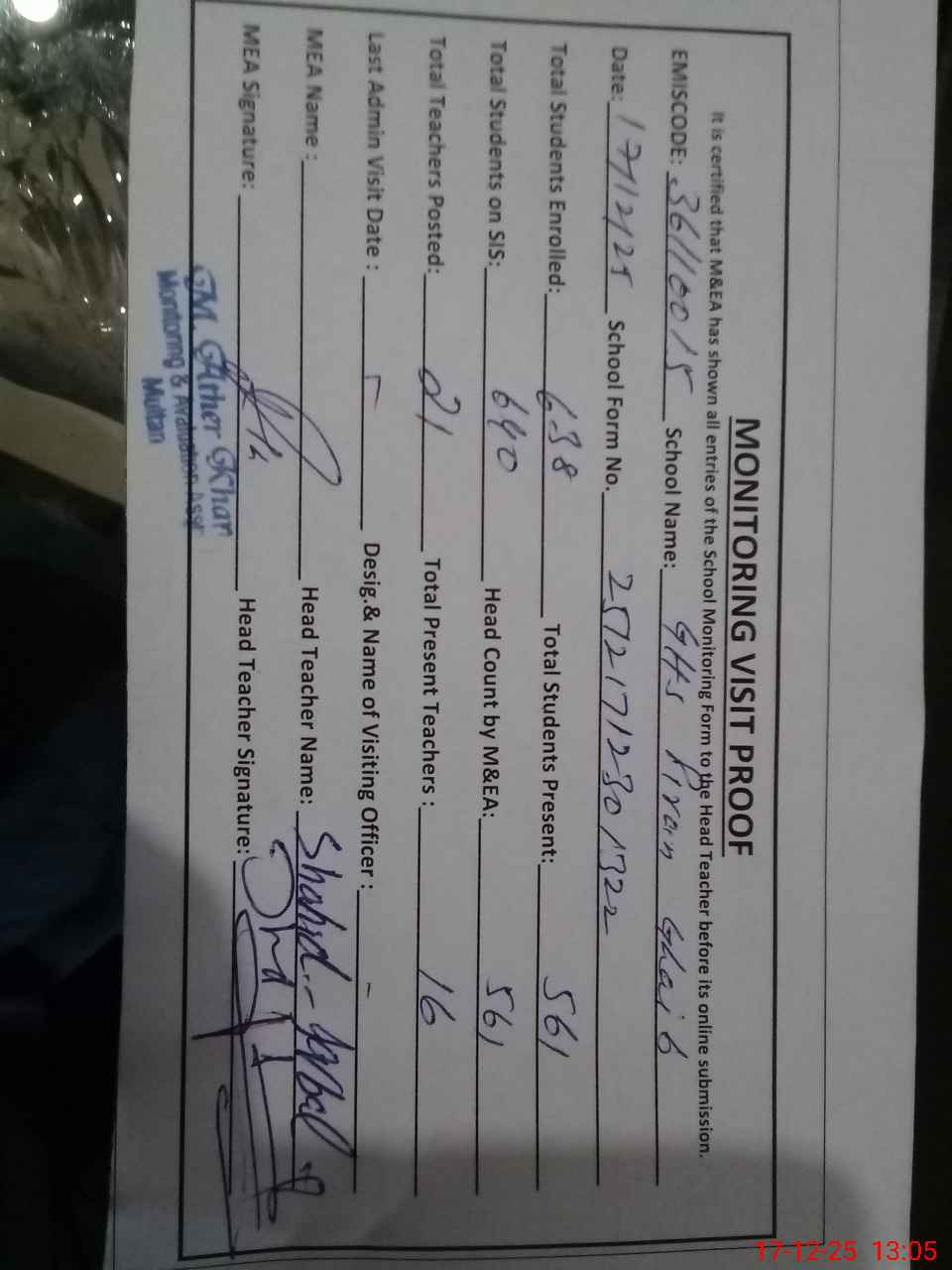 | Attendance Register | Head Teacher | MEA with School | Visit Proof |