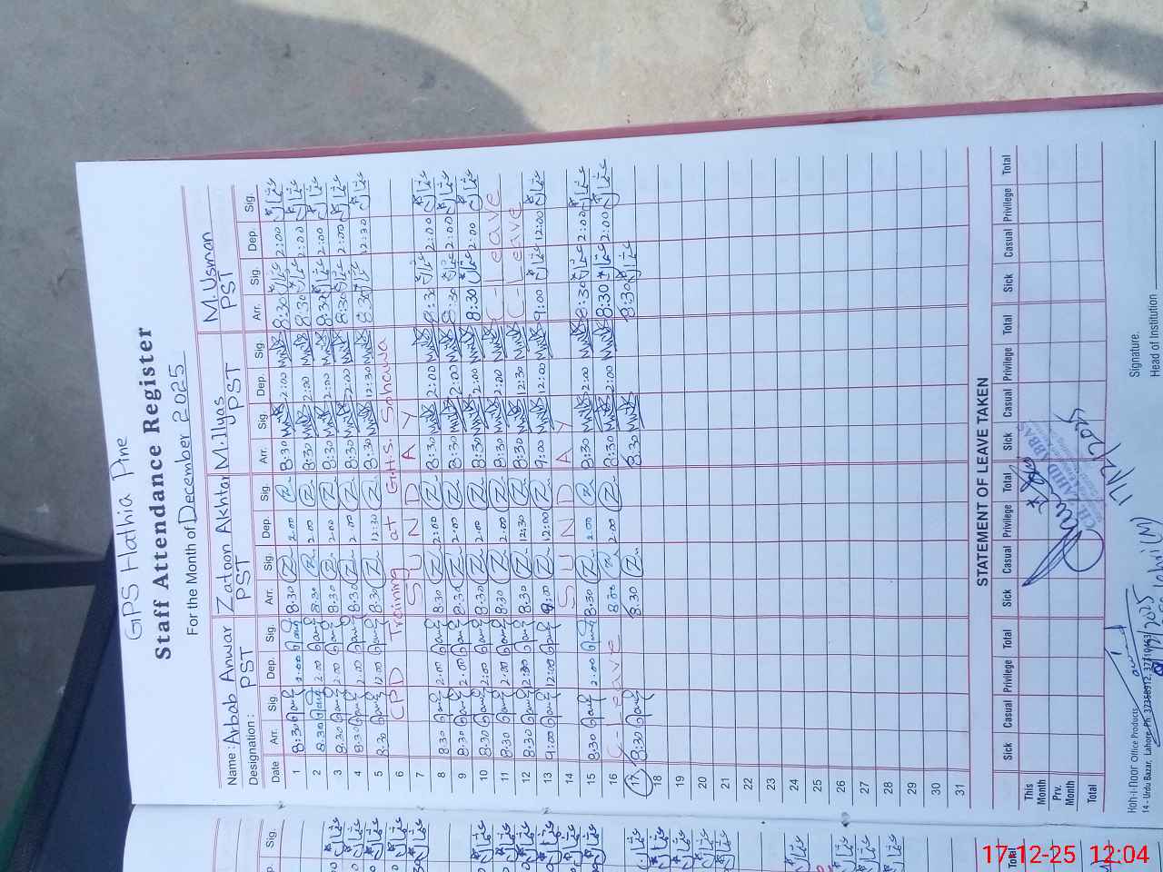 | CNIC | Full Name | Designation | R/C | Absence During Last Calender Month |