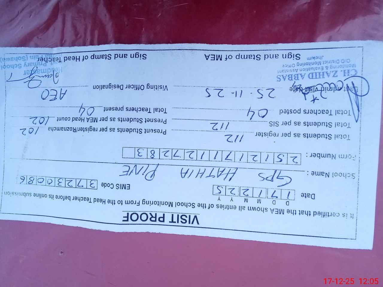 | Monitoring Date: 17-12-2025 | Start Time: 17-12-2025 11:27 AM | End Time: 17-12-2025 12:08 PM | Name of MEA: Za**** Ab**** | |