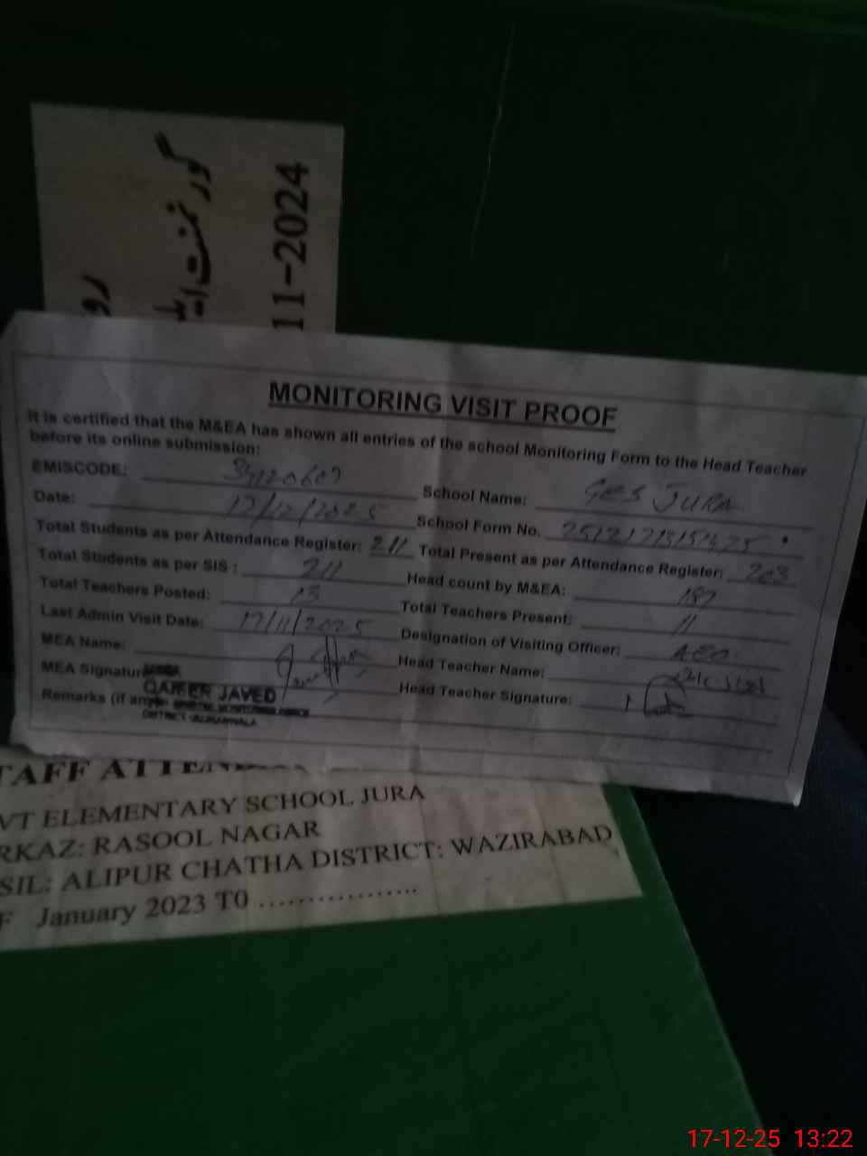 | Attendance Register | Head Teacher | MEA with School | Visit Proof |