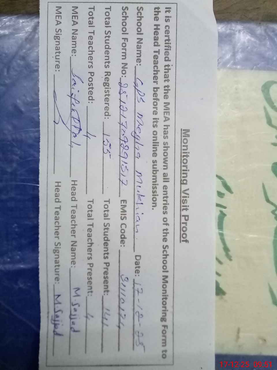 | EMIS Code: 31110174 | Name of School: GPS MEGHA MUKHIAN | |||
