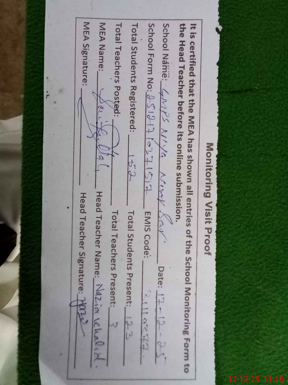 | Attendance Register | Head Teacher | MEA with School | Visit Proof |