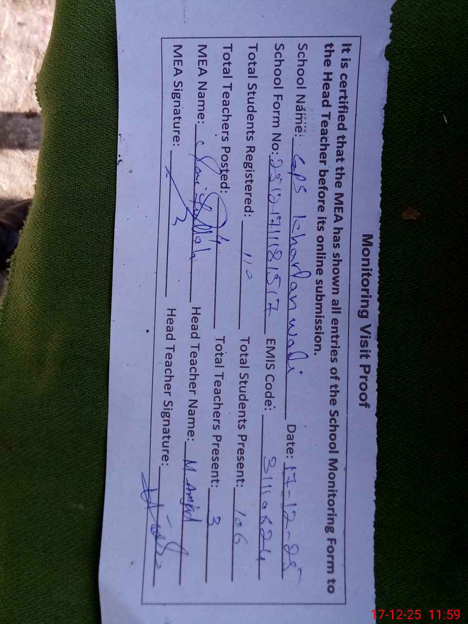 | Attendance Register | Head Teacher | MEA with School | Visit Proof |