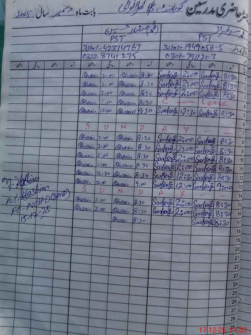 | CNIC | Full Name | Designation | R/C | Absence During Last Calender Month |