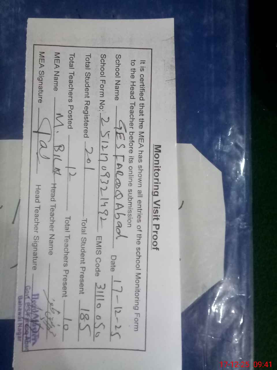 | Attendance Register | Head Teacher | MEA with School | Visit Proof |
