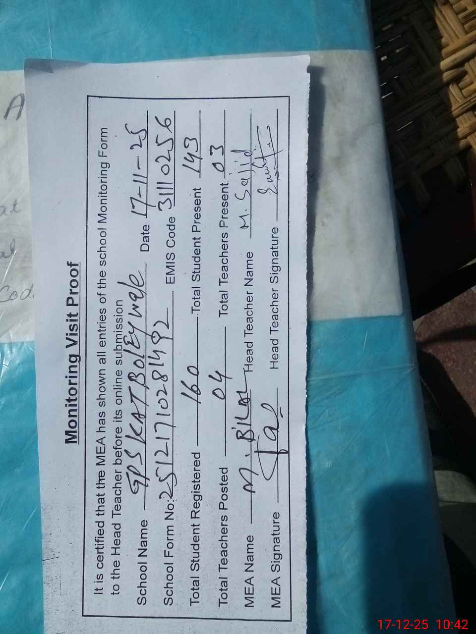 | Attendance Register | Head Teacher | MEA with School | Visit Proof |
