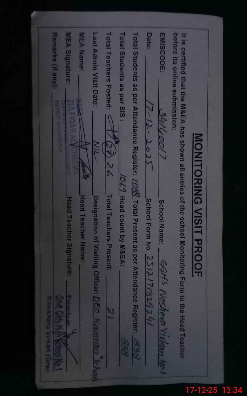 | EMIS Code: 34140017 | Name of School: GGHS NOWSHERA VIRKAN NO.1 | |||