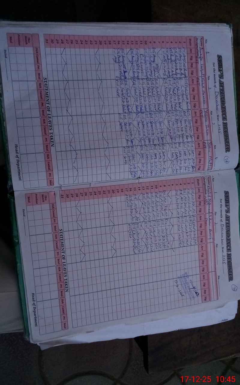 | CNIC | Full Name | Designation | R/C | Absence During Last Calender Month |