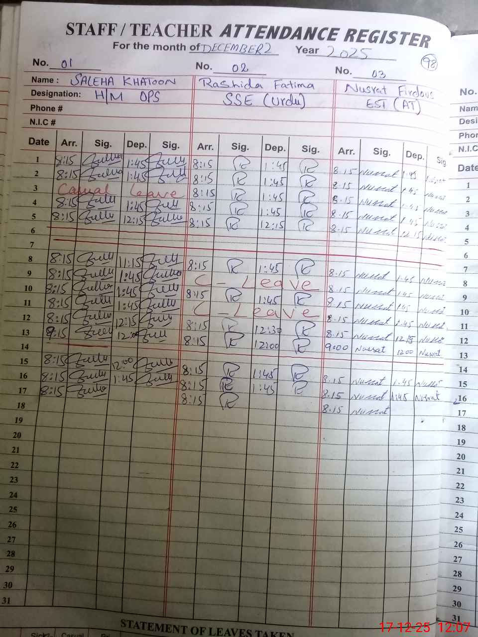 | CNIC | Full Name | Designation | R/C | Absence During Last Calender Month |