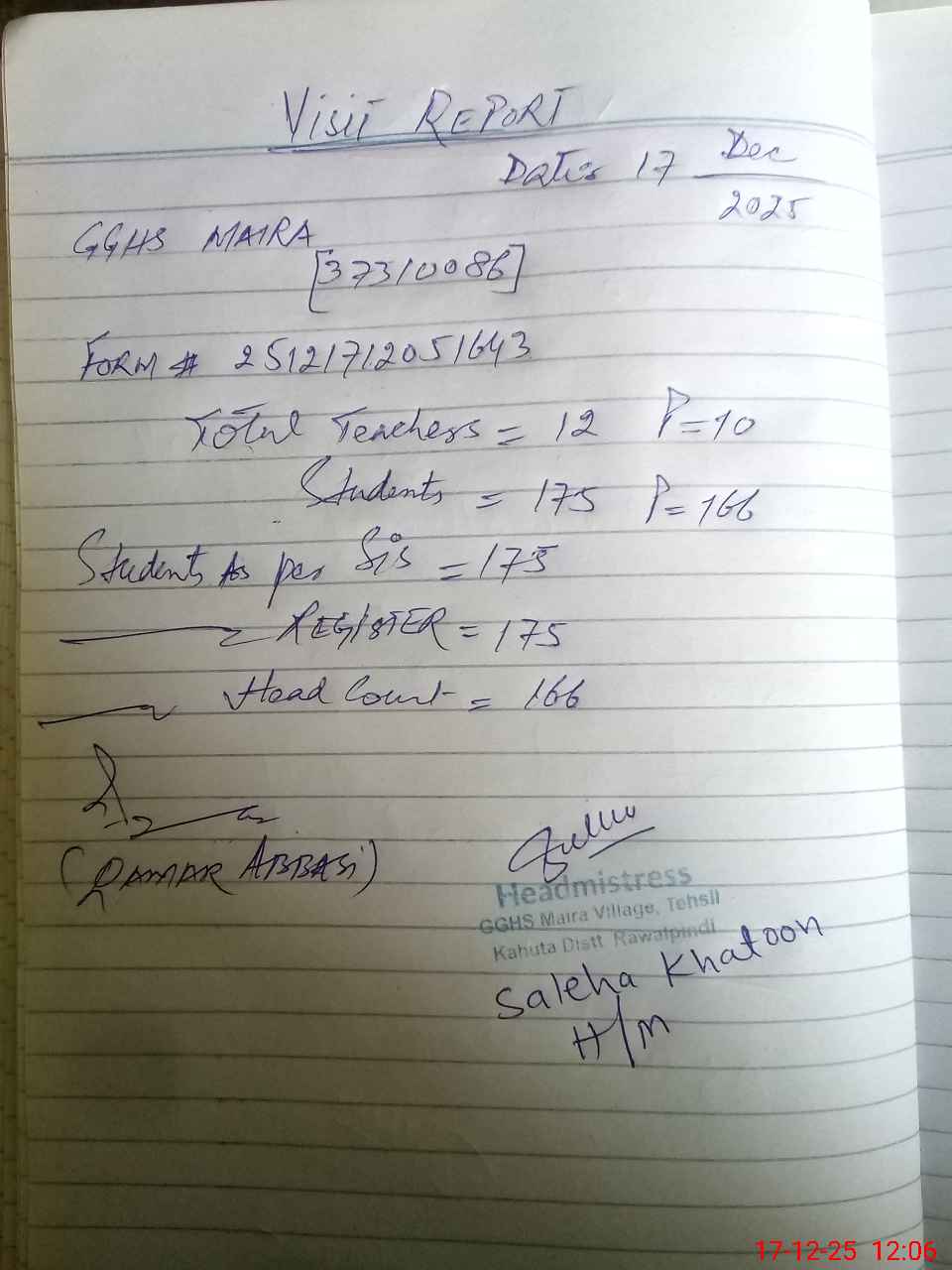 | Attendance Register | Head Teacher | MEA with School | Visit Proof |
