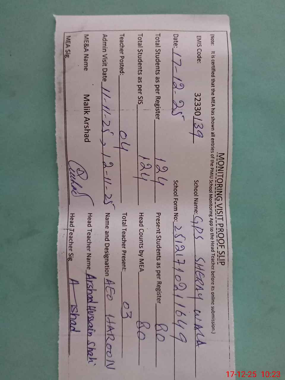 | Attendance Register | Head Teacher | MEA with School | Visit Proof |