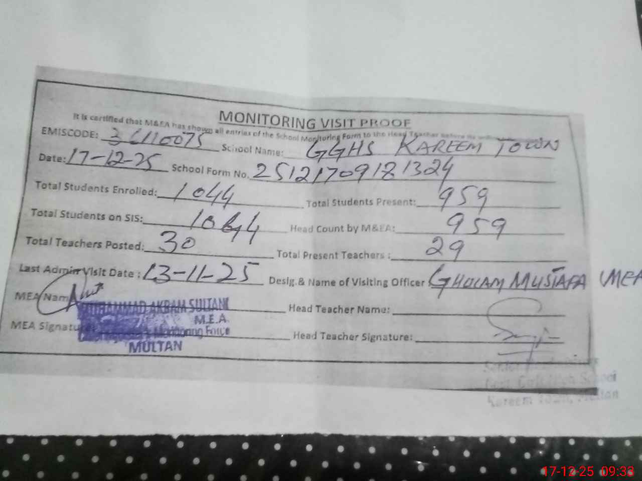 | EMIS Code: 36110075 | Name of School: GGHS KARIM TOWN NEAR CHOWK KUMHARAN WALA MULTAN | |||