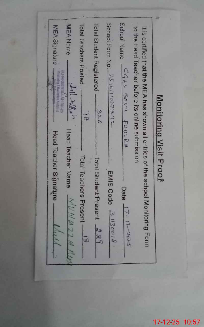 | EMIS Code: 31130018 | Name of School: GGHS BASTI PHULARA | |||