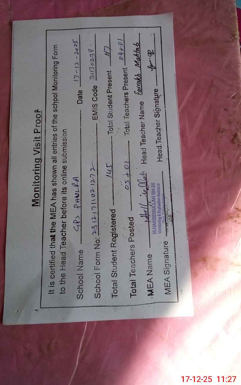 | EMIS Code: 31130239 | Name of School: GPS PHULRA FORT ABBAS | |||
