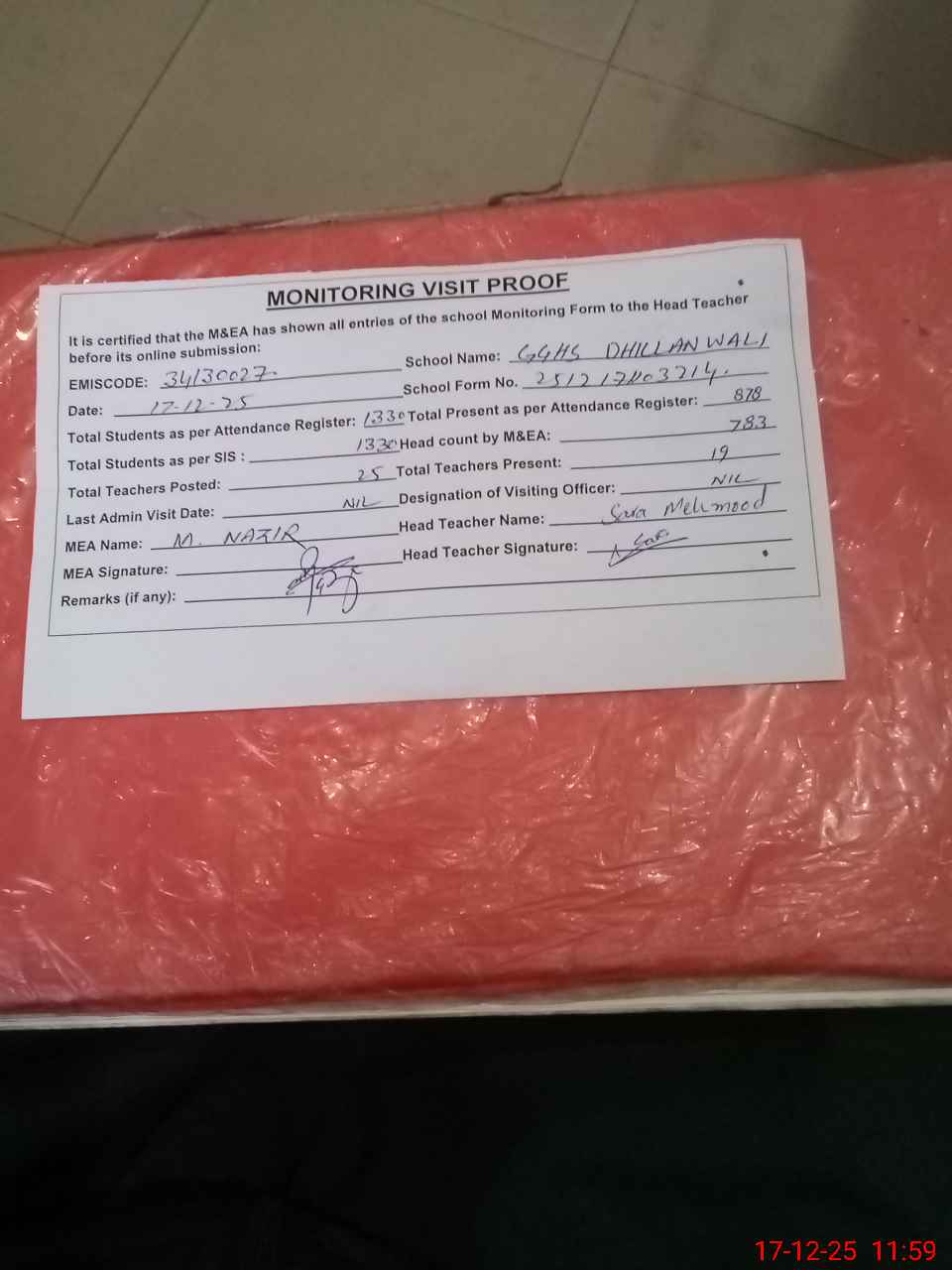 | EMIS Code: 34130027 | Name of School: GGHS DHILLAN WALI | |||