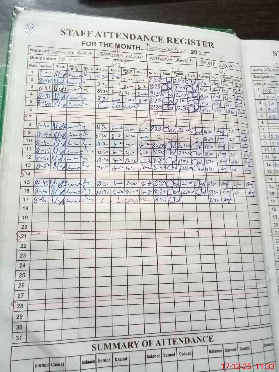 | CNIC | Full Name | Designation | R/C | Absence during last cal. month |