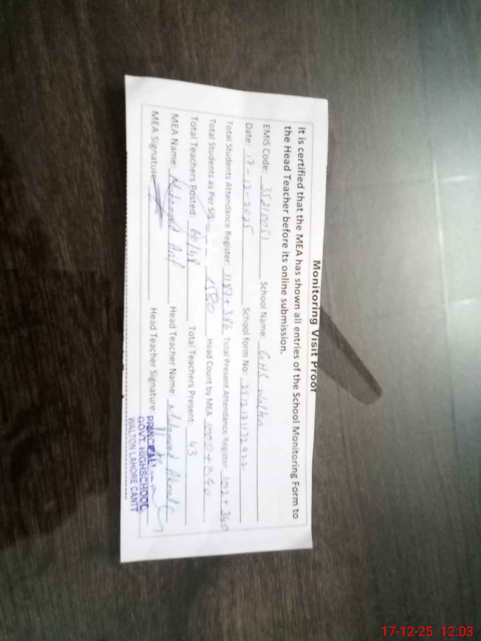 | Attendance Register | Head Teacher | MEA with School | Visit Proof |