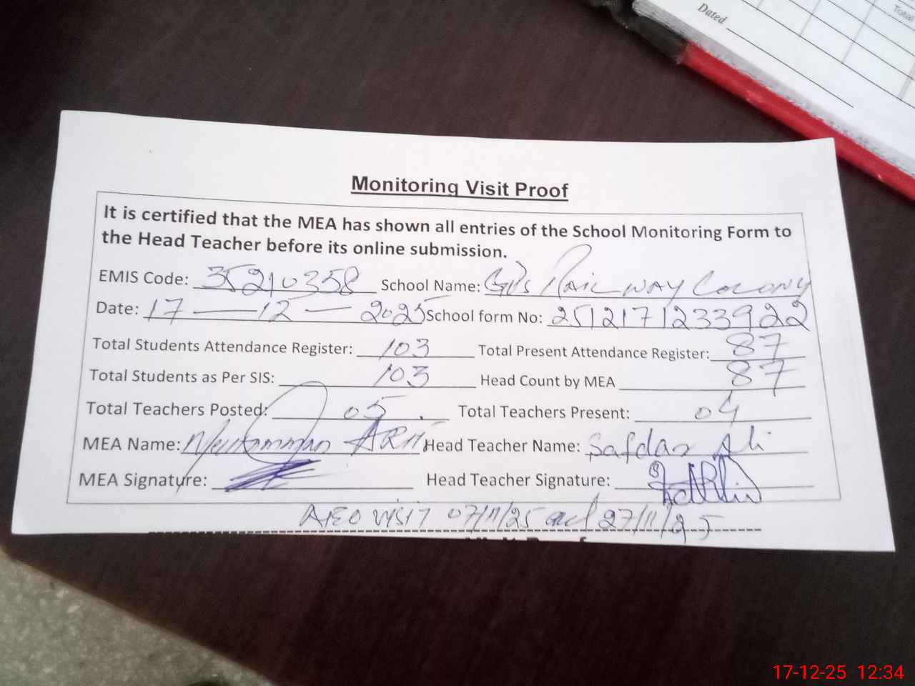 | EMIS Code: 35210358 | Name of School: GPS RAILWAY COLONY WALTON | |||