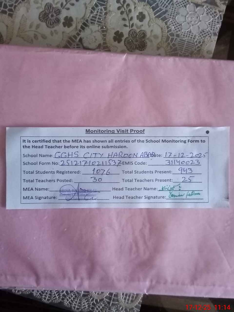 | Certified that this School was Inspected by the Undersigned MEA/DMO Today and the Information Stated Above is as Per Record. | |||||