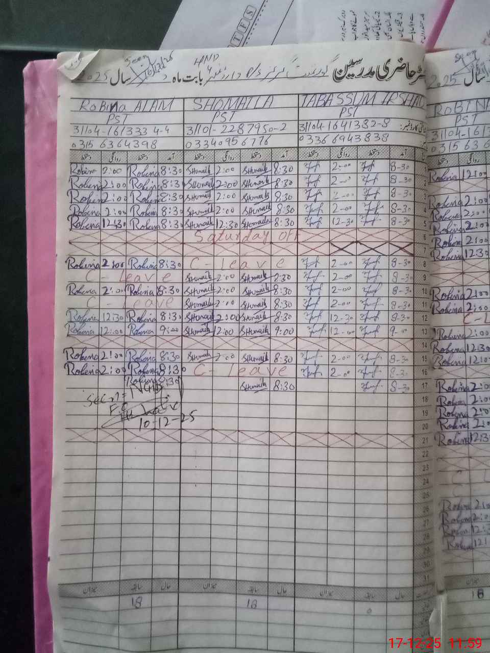 | CNIC | Full Name | Designation | R/C | Absence During Last Calender Month |