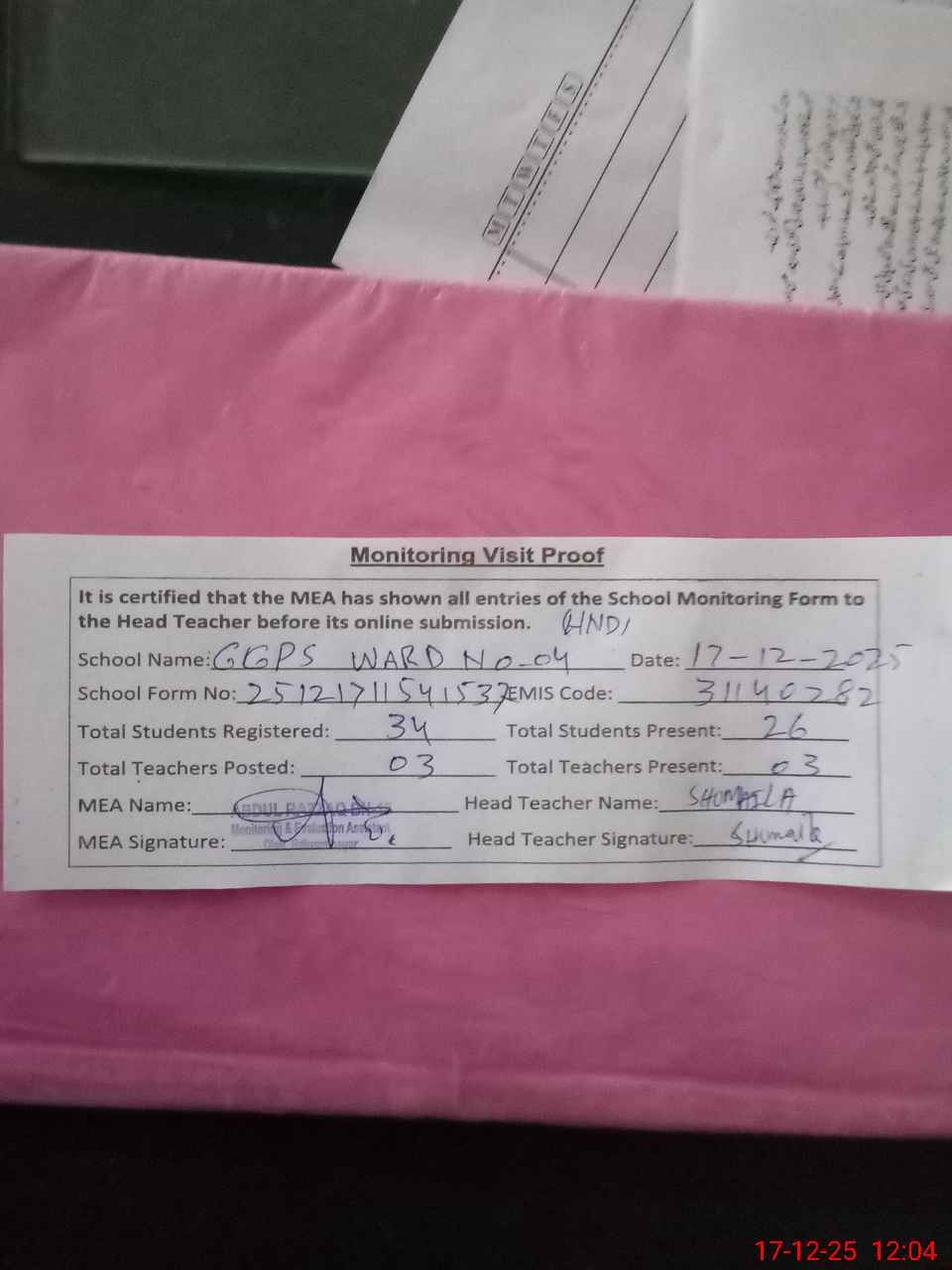 | Attendance Register | Head Teacher | MEA with School | Visit Proof |