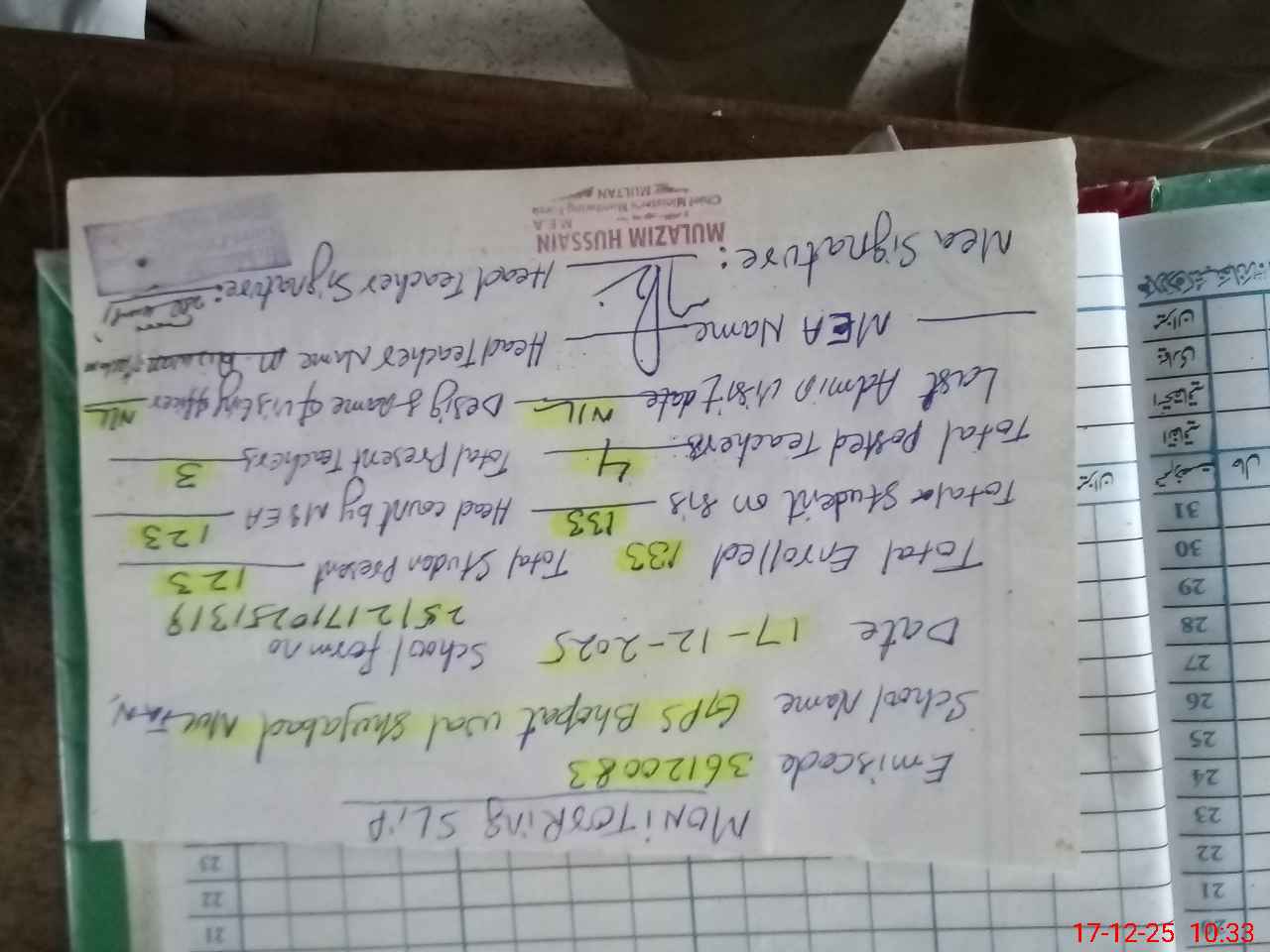 | Attendance Register | Head Teacher | MEA with School | Visit Proof |