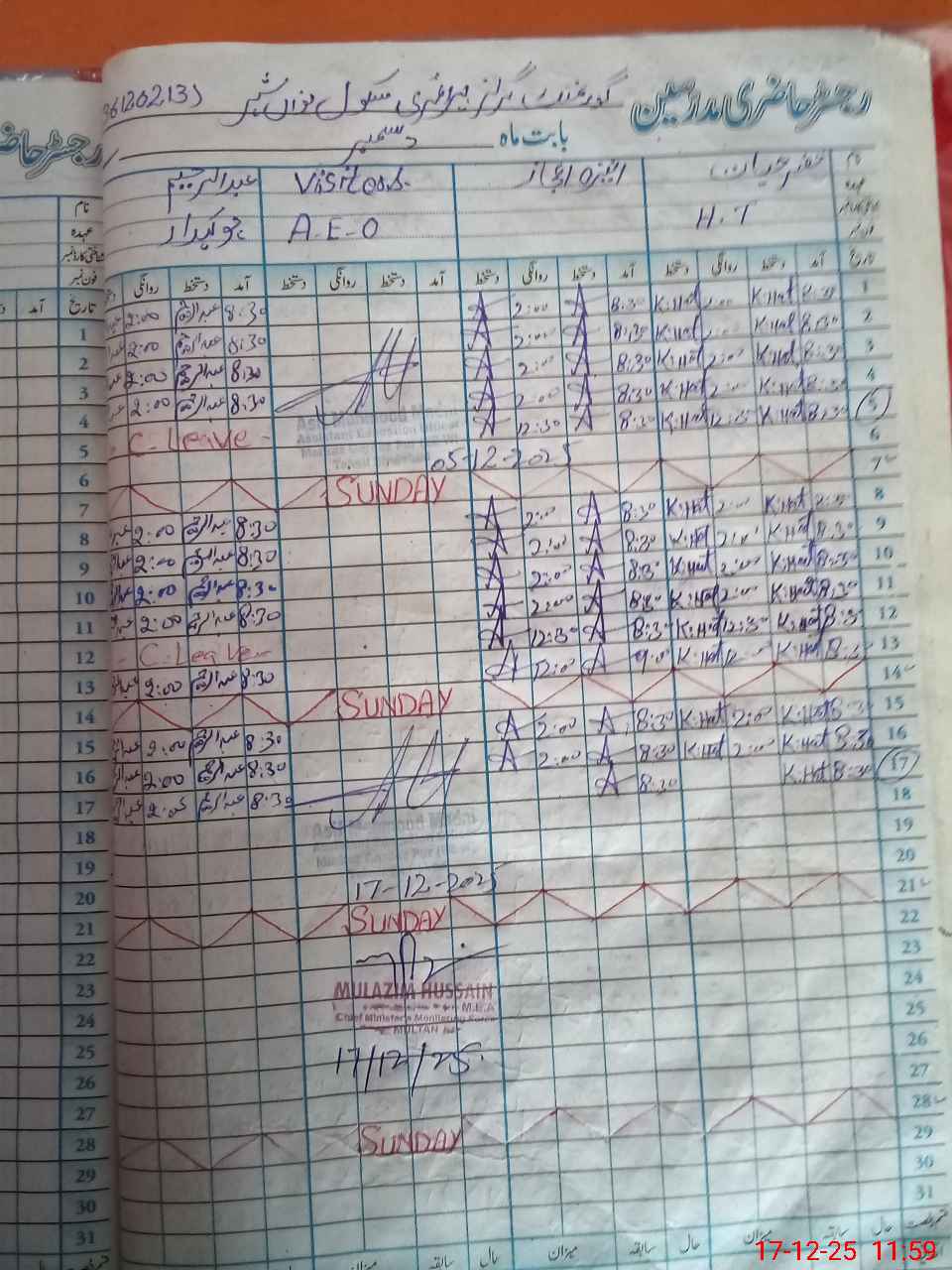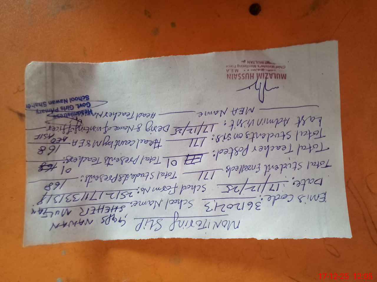 | Attendance Register | Head Teacher | MEA with School | Visit Proof |