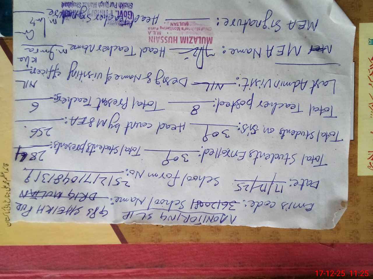 | Attendance Register | Head Teacher | MEA with School | Visit Proof |