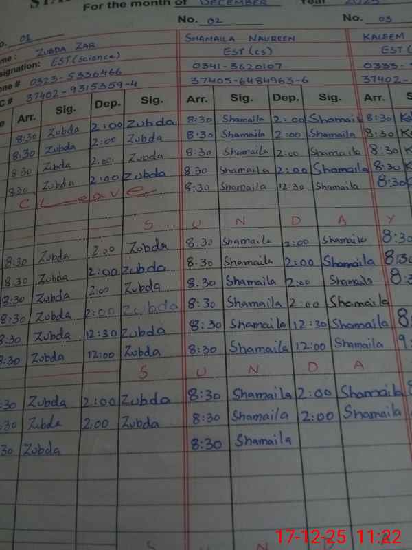| CNIC | Full Name | Designation | R/C | Absence During Last Calender Month |