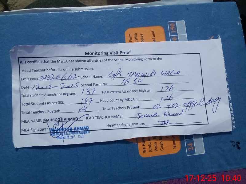 | EMIS Code: 32320662 | Name of School: GPS TANWRI WALA | |||
