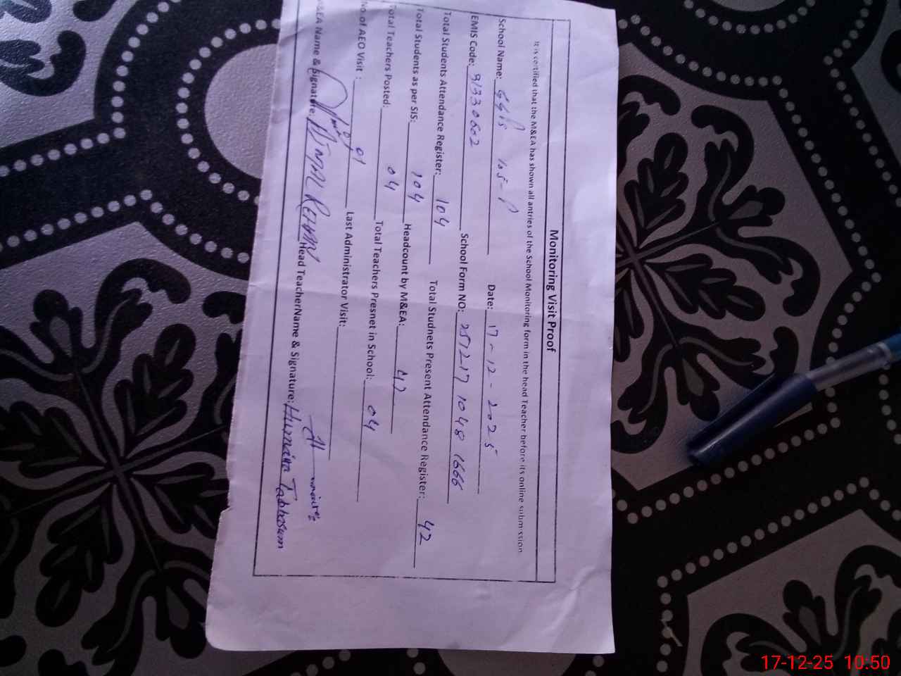 | Attendance Register | Head Teacher | MEA with School | Visit Proof |