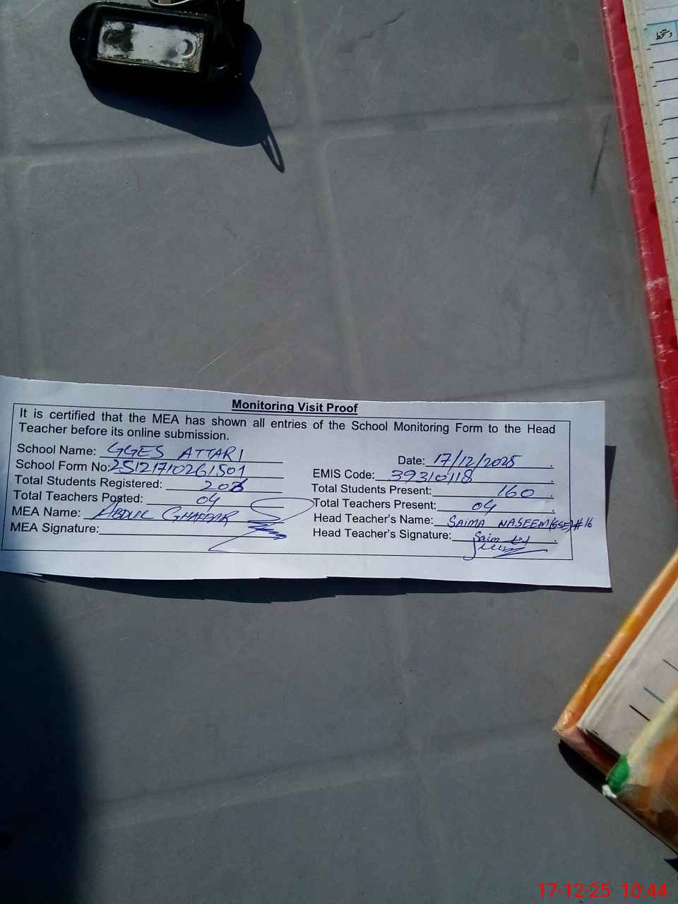| Attendance Register | Head Teacher | MEA with School | Visit Proof |
