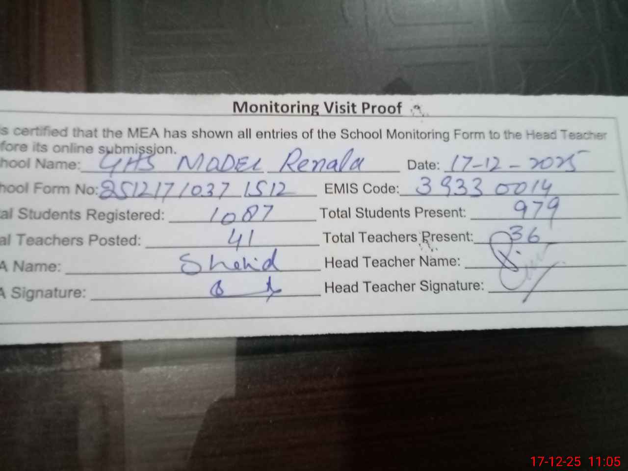| Attendance Register | Head Teacher | MEA with School | Visit Proof |