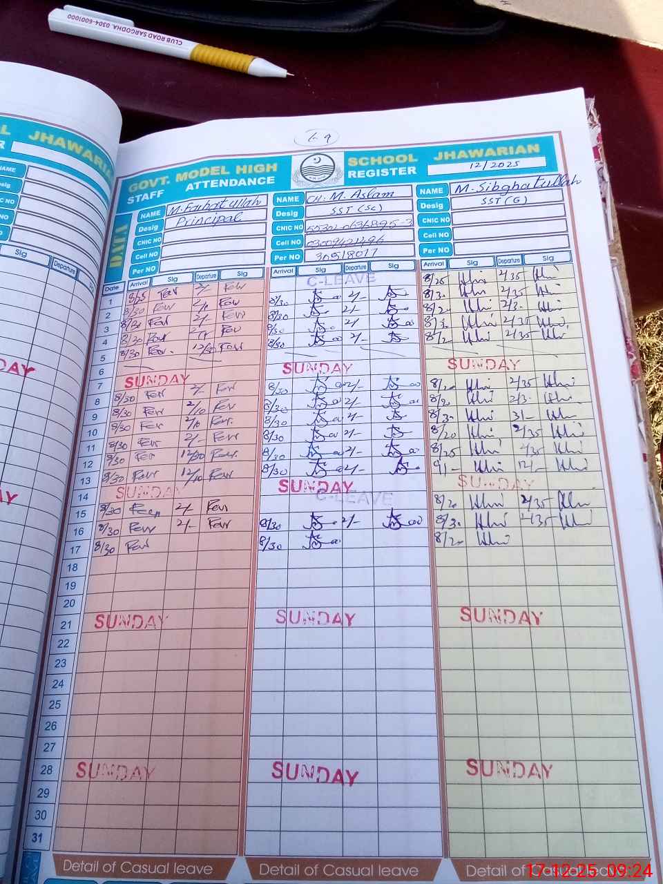 | CNIC | Full Name | Designation | R/C | Absence during last cal. month |