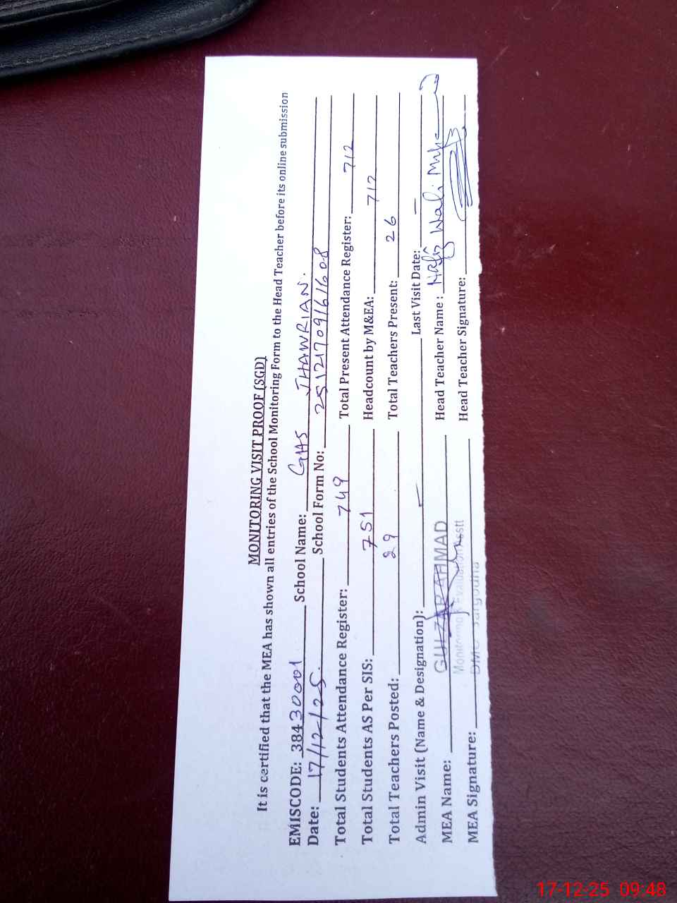 | Attendance Register | Head Teacher | MEA with School | Visit Proof |