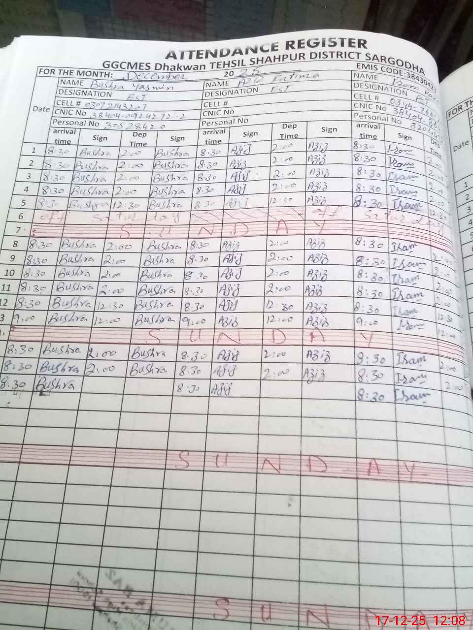 | CNIC | Full Name | Designation | R/C | Absence during last cal. month |