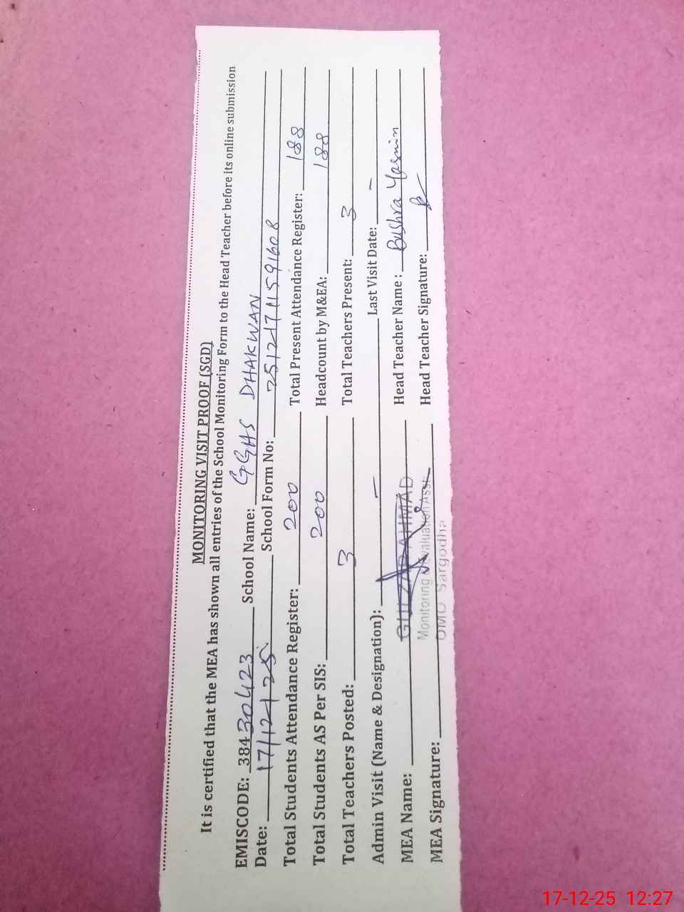 | Attendance Register | Head Teacher | MEA with School | Visit Proof |